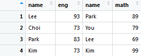 위의 데이터프레임을 보시면 eng와 math에서 공통으로 존재하는 name에 한해서 합쳐진 것을 보실 수 있습니다.