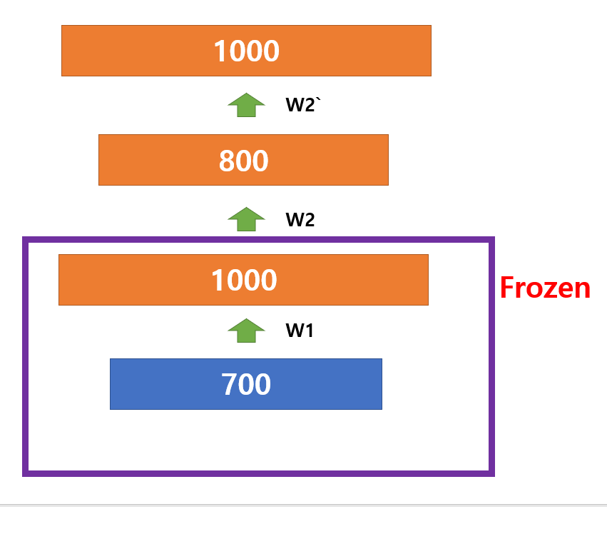 다음으로 W2를 학습 시키기 위해서 W1은 이전에 구한 Weight로 고정시키기 위해서 Learning rate를 0으로 설정 (변화되지 않음) 하고 같은 방법으로 AutoEncoder를 통해 W2를 학습합니다.