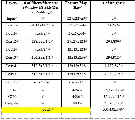 227x227x3 의 이미지를 처리하는데 5개의 Convolution layer와 3개의 pooling layer 그리고, 2개의 Fully connected layer로 구성된 네트워크를 사용합니다.