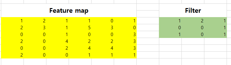 Filter가 이미지인 Feature map에 어떻게 적용되는지를 알아보기 위해서 간단한 예시를 준비해보았습니다.