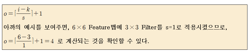 일반적으로 i x i Feature맵에 k x k filter를 s라는 stride를 가지고 적용시킬 때, output의 사이즈는 다음과 같습니다.