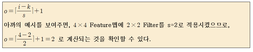 일반적으로 i x i Feature맵에 k x k maxpooling을 s라는 stride를 가지고 적용시킬 때, output의 사이즈는 다음과 같습니다.