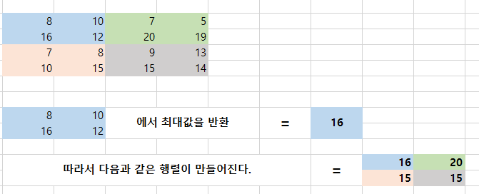위의 예시에서 Filter를 통과한 Feature맵에 대해 2x2 Max pooling (Stride = 2)을 적용해보도록 하겠습니다.