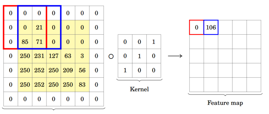 Zero padding은 기존의 Feature 맵의 가장자리에 0을 추가하는 것입니다. 3x3 Filter를 적용하면, 크기가 줄어드지 않게 됩니다.