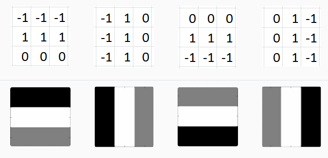 1은 흰색을 의미하고, 0은 회색, 그리고 -1은 검정색을 의미합니다. 이는 이미지의 특징을 추출할 때, 명암을 의미합니다.
