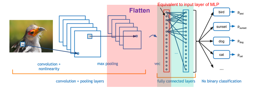 CNN의 목적은 이미지의 분류이기 때문에, 원본 이미지가 Convolution layer와 Pooling layer를 거쳐서 중요한 특징을 포함하는 feature맵으로 결과가 나오게 되면 우리는 이를 input으로 받아들이고, MLP와 같은 방법으로 분류합니다.