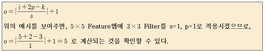 일반적으로 i x i Feature맵에 k x k filter를 s라는 stride와 p의 padding을 가지고 적용시킬 때, output의 사이즈는 다음과 같습니다.