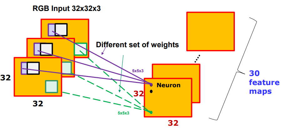 예를 들어서 32x32x3 이미지가 있을 때, 5x5x3 filter로 30개의 feature맵을 만들어 낸다고 생각해봅시다.