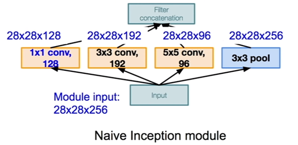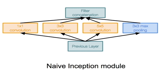 Inception Module은 이전 layer에서 나온 output을 input으로 받아들이고, 3개의 convolution layer와 pooling layer를 수평적으로 합성합니다.