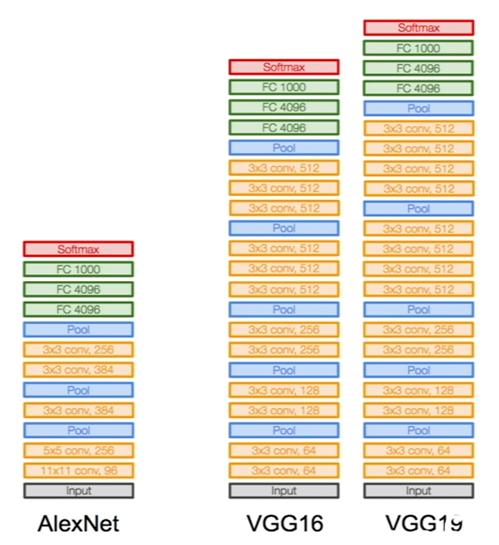 다음 그림은 VGGNet과 AlexNet의 차이를 간략하게 보여줍니다.