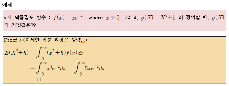 이처럼 x의 평균이 아닌 g(x)의 평균을 구하라는 문제가 나오면은 기댓값 계산 식에서 x가 아닌 g(x)를 대입하여 적분해주시면 됩니다.