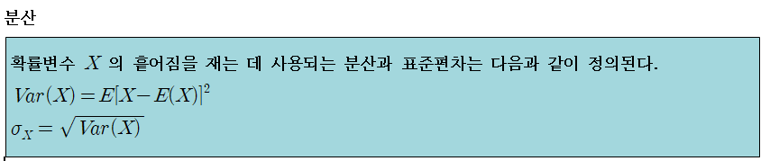 우선, 분산의 정의는 위와 같습니다. 분산은 확률변수의 흩어짐을 재는 척도로써, 분산이 크면 변수들이 넓게 분포하고 있다는 것을 의미하며, 분산이 작다는 것은 변수들이 조밀하게 분포하는 것을 의미합니다.