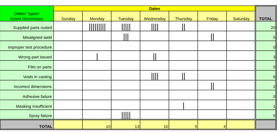 체크 시트 (Check sheet)는 미리 표를 만들어 두고 작업을 하면서 그 결과를 표시하여, 그날의 작업과 제품상황을 알 수 있도록 만든 것입니다. 데니터를 수집, 정리하는 수고를 덜 수 있으며 점검표를 사용하면 체크 누락을 예방할 수 있습니다.