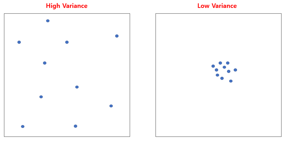 우선, 분산의 정의는 위와 같습니다. 분산은 확률변수의 흩어짐을 재는 척도로써, 분산이 크면 변수들이 넓게 분포하고 있다는 것을 의미하며, 분산이 작다는 것은 변수들이 조밀하게 분포하는 것을 의미합니다.