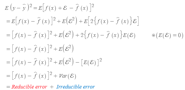 따라서 머신러닝 알고리즘은 reducible error를 최소로 하는 것을 목표로 하게 됩니다. (Irreducible error는 알지못하는 오차로 조절 x)
