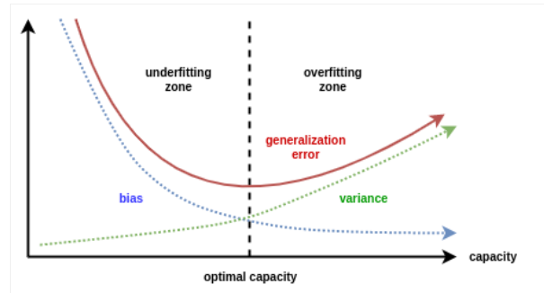 위의 그림처럼 bias와 variance 사이에는 트레이드 오프 관계가 존재하기 때문에, underfitting 과 overfitting을 최소화 할 수 있는 최적의 모델을 찾는것이 목표입니다.