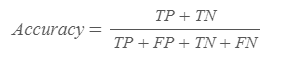 Accuracy는 모든 예측값중에서 실제 값을 맞춘 개수의 비율을 나타냅니다.