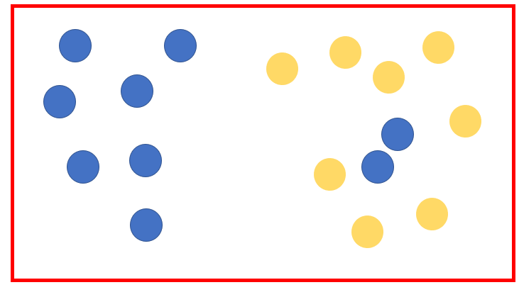 위과 같은 공간에서 빨간공과 파란공은 분류 할 때, 점선을 통해 분류를 한다면 Entropy의 변화가 어떻게 발생할까요?