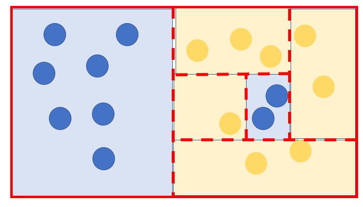 위와 같은 상황에서 파란색 공과 노란색 공은 분류하고자 할 때, 의사 결정나무를 너무 깊게 만들면, 다음과 같이 학습이 됩니다.