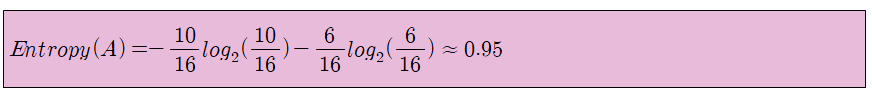 우선, 점선으로 분류되기 전의 엔트로피를 계산해보면 다음과 같습니다. (빨간공 10개, 파란공 6개)