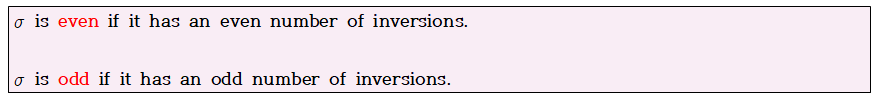 이제 Permutation에 대해서 Inversion의 개수가 홀수개라면, odd로 반면에 짝수개라면, even으로 정의하도록 하겠습니다.