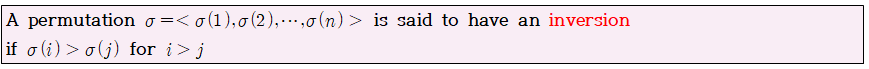 Inversion은 말 그대로, Permutation의 성분중에서, 앞의 값이 뒤의 값보다 더 큰 경우를 의미합니다.