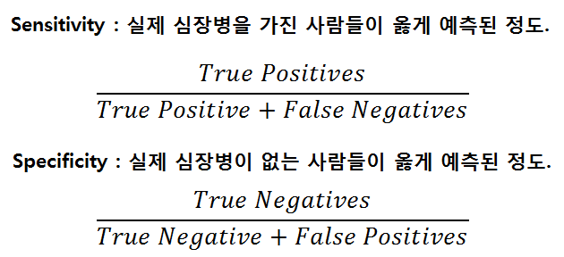 분류 모델의 Sensitivity가 작다면, 심장병 환자에게 심장병이 아니라고 진단하는 것인데 매우 심각한 문제입니다.