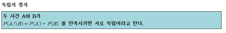 독립이라는 개념은 간단하게 말해서 두 사건의 교집합의 확률이 두 사건 각각의 확률을 곱셈과 같은 경우를 말합니다.