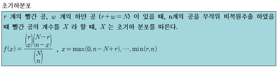 N개의 공이 r개의 빨간공과 w개의 하얀공으로 구성되어 있을 때, n개의 공을 무작위로 비복원추출 (꺼낸 후 다시 넣지 않음) 하였을 때, 빨간공의 수를 X라 할 때 X가 따르는 분포를 초기하분포라고 합니다.