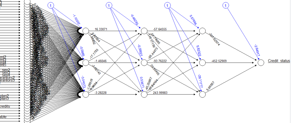 NN = neuralnet(Credit_status ~ . ,td1, hidden = c(3,3,3,3,3), linear.output = F, err.fct = 'ce', likelihood = T)