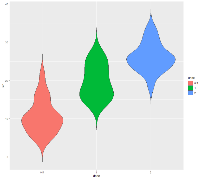p<-ggplot(ToothGrowth, aes(x=dose, y=len, fill=dose)) +