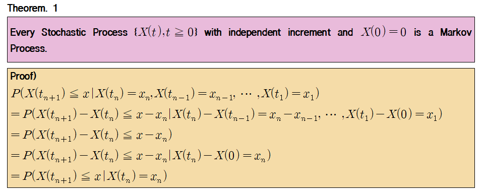 정리 1은 independent increment를 가지는 모든 Stochastic 과정은 모두 마코프 과정이라는 소리입니다.