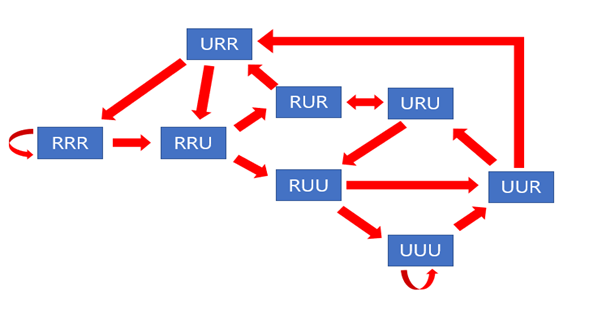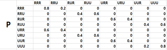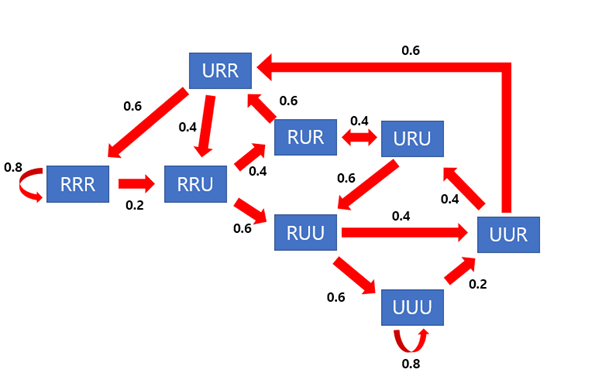 다음 날의 비가 오거나 그렇지 않을 확률은 이전 3일동안의 결과에 따라 달라지므로, 3일동안 가능한 경우의 수는 RRR, RRU, RUR, RUU, URR, URU, UUR, UUU 총 8가지가 된다. 따라서 State는 총 8개가 필요하고, 미래의 시점의 비가 올 확률은 그 이전 state로부터만 영향을 받으므로 Markov chain이라고 할 수 있다. 위 문제의 Markov chain을 그림으로 표현하면 다음과 같다.
